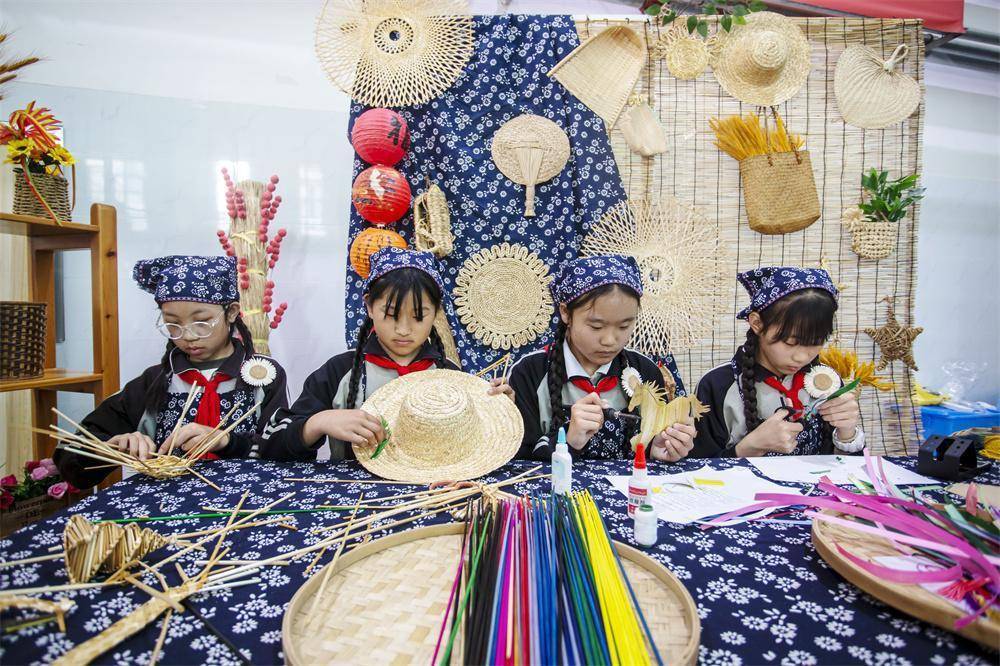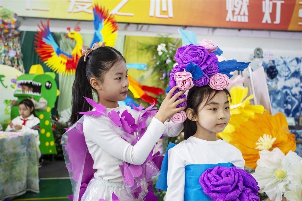 该校学生用废纸制作花朵、头饰工艺品,变废为宝。聂长青摄