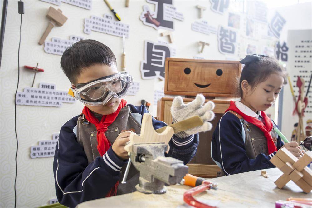 人民小学童匠木工坊,孩子们制作工艺品。聂长青摄