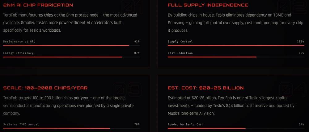 但根据TeraFab官网上的披露,其预估投资仅仅为200亿至250亿美元,还是来自特斯拉的支持,但特斯拉2026年的资本支出计划已经提升到 200 亿美元,但这些钱还不够Terafab一个项目烧的。